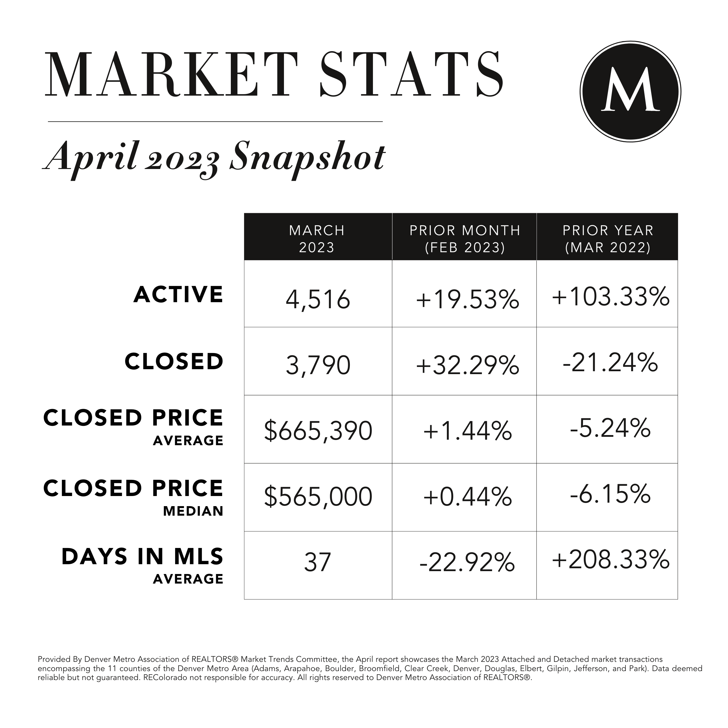 PREMIER MARKET ($500,000 - $749,999): "With the fall slow down, bank shutdowns, and interest rates like a rollercoaster ride, one would expect to see the some impact on listings in the Premier Market, but that isn't the case. New listings in the Premier Market were up 57.45% from one month ago. Buyers obviously didn't care too much about the higher rates as we saw 15.58% of new listings move to pending status and 28.54% close. Sellers needed to be ready to move quickly with the median days in MLS dropping 51.29% from February. Pricing is key, and it appears that REALTORS® were pricing it right as we saw the close-price-to-list-price ratio come in at 99.98% last month. Great job nailing that pricing REALTORS® and learning to shift with this changing market." Brigette Modglin, DMAR Market Trends Committee member, and Denver REALTOR®. -
