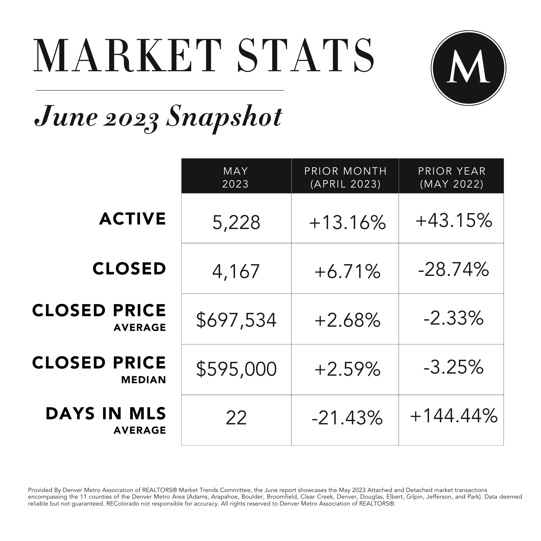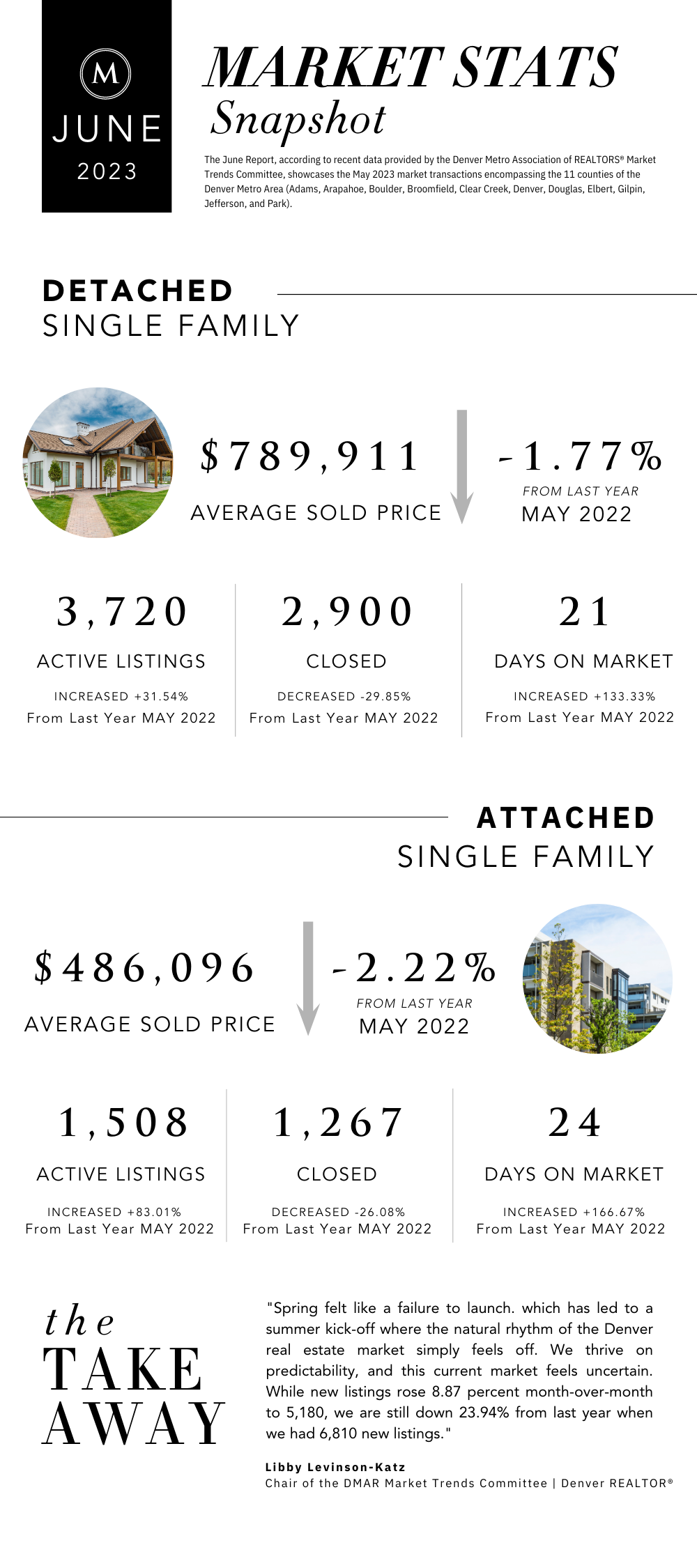 LUXURY MARKET ($1,000,000 AND UP): "As Dorothy might have said if she were in this market, "Toto, I have a feeling we aren't in 2022 anymore." What a difference a year makes! Everything about the $1-million market is lower and slower than it was this time last year. Comparing 2023's year-to-date numbers to the same time last year, all indicators point to a slowdown in this price bracket: the number of closed homes was down 30.13%, pending sales were down 16.83%, total sales volume was down 28.32%, price per square foot was down 2.53%, and the median days in MLS was up a whopping 125%. Considering the economic turmoil experienced since May of 2022 - record-breaking interest rate increases, bank failures, high inflation, the crash of the crypto market and debt ceiling drama - this slowdown is understandable. In uncertain economic times, it's natural for people to pump the breaks on spending, pause and wait for the economy to steady itself." Colleen Covell, DMAR Market Trends Committee member & Denver REALTOR®. -