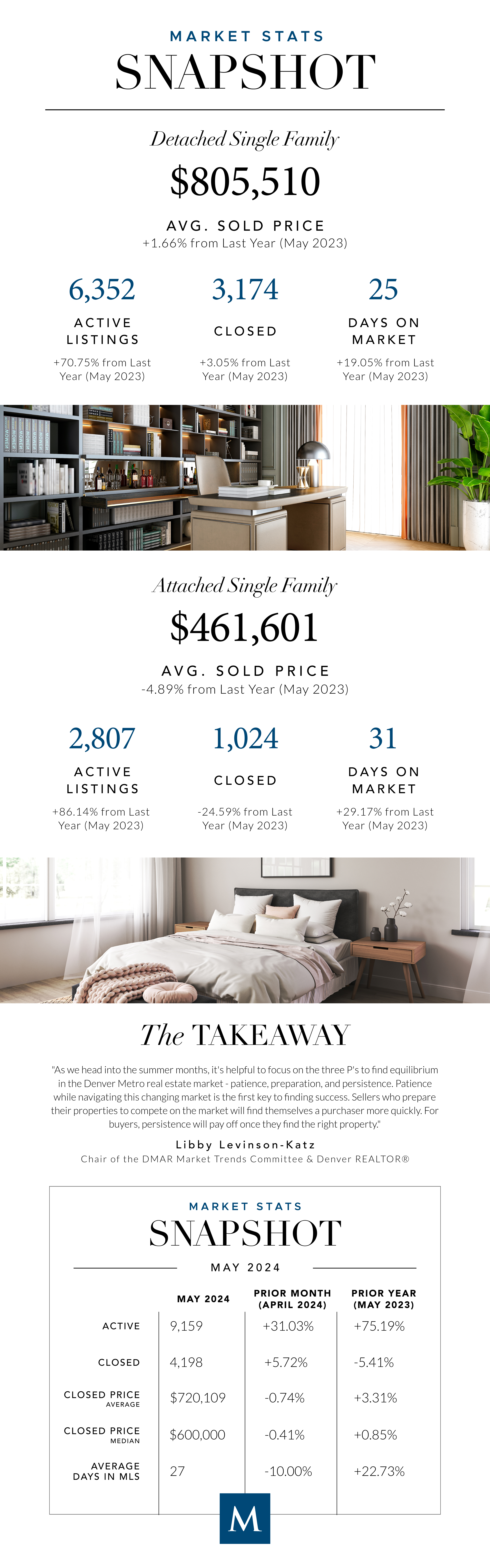 PREMIER MARKET ($500,000 - $749,999) "While prices in this segment remain steady, (posting positive close-price-to-list-price ratios last month, month-over-month, and year-over-year) active listings are beginning to accumulate. For their part (and to their credit), buyers are shopping, but today's consumers are being more selective than ever. Sellers should be prepared for knowledgable buyers this summer and be patient with difficult economic conditions. Major repairs are dealbreakers and need to be taken care of proactively before listing or closing. If not, unwilling sellers should prepare for the majority of would-be buyers to pursue other homes or explore new home communities instead. While May's data displays a noticeable uptick in inventory, buyers shopping for homes between $500,000 and $749,999 are cautioned to be prepared, too. In this price range, homes move fast." Michelle Schwinghammer, DMAR Market Trends Committee Member & Denver REALTOR®. *Remarks from Pages 14-15 of the May 2024 Market Trends Report from DMAR | | |