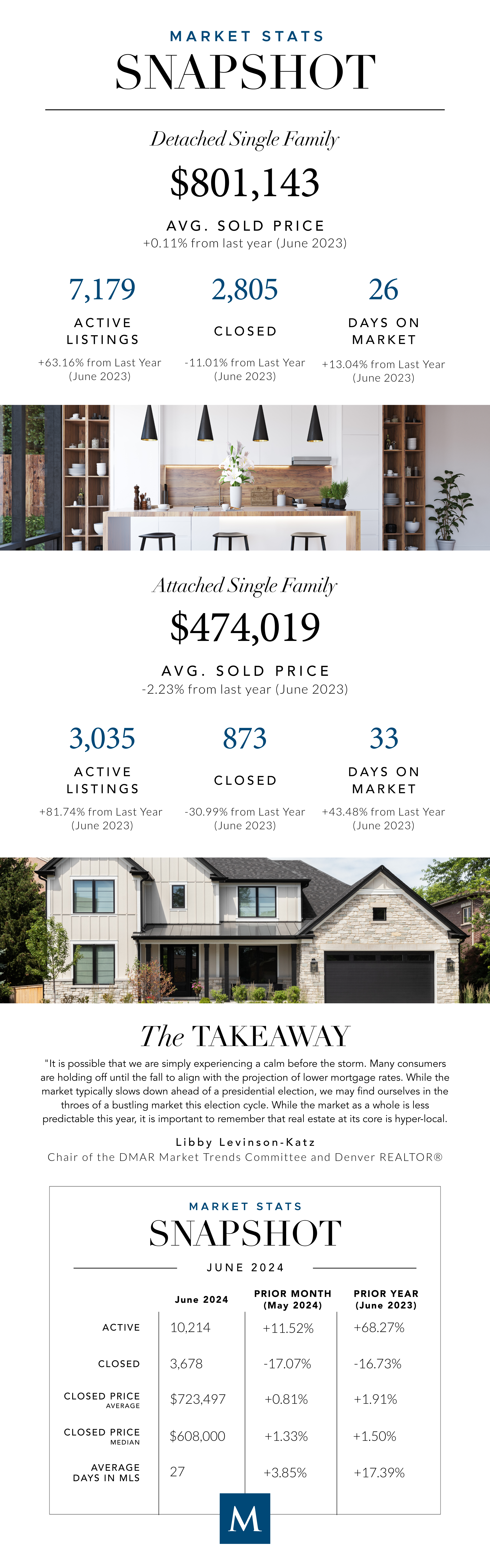 - SIGNATURE MARKET ($750,000 - $999,999): "Traditionally, the 4th of July represents more than just fireworks and fun; it also marks the end of the summer buying season. This timing makes sense as most buyers want to settle into their new homes before the end of summer and the start of the school year. This year, however, the fireworks went off early, leaving June uncharacteristically slow. The gap between sellers and buyers continues to widen, as does the preference for detached over attached properties. June provided proof that this market continues to evolve and test the resilience of both buyers and sellers. As Realtors® advising our clients, using market indicators, setting expectations and relying on our intuition have never been more important." Andrew Abrams, DMAR Market Trends Committee Member & Denver REALTOR®.